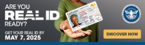 Are you REAL ID ready? Beginning May 7, 2025, anyone 18 years and older that plans to fly domestically or visit certain Federal facilities will need a REAL ID or another acceptable form of identification. If your Drivers License / ID has a star (and/or flag) or says “Enhanced”, it should be REAL ID ready. If not, you will need to provide an alternative form of identification, such as a valid passport or passport card. For more information, visit the REAL ID website.